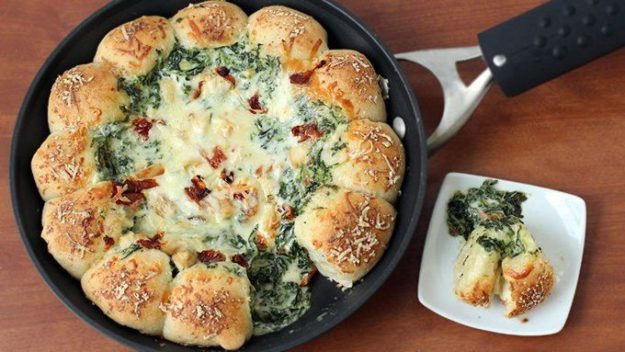 Skillet Pizza Dip 1 teaspoon butter9 ounces frozen chopped spinach (thawed)1 cup creamy Alfredo sauce1 cup freshly shredded mozzarella cheese (divided)1 cup diced chicken breast (divided)1/2 cup chopped sun-dried tomatoes ((packed in oil and drained) divided)3 sticks mozzarella string cheese1 tube Pillsbury™ refrigerated classic pizza crust1 egg white1 teaspoon extra virgin olive oil2 tablespoons Parmesan…