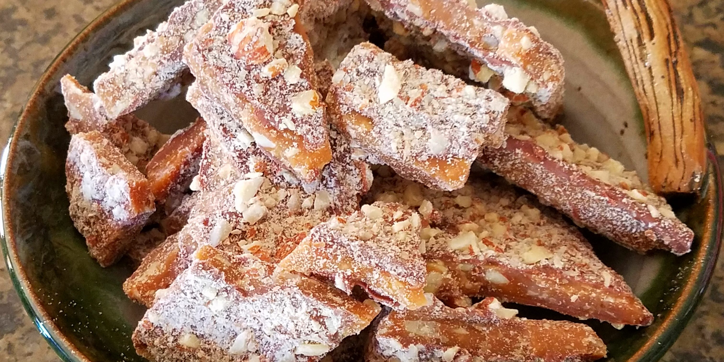 - Combine remaining butter, corn syrup and water in a medium-size heavy saucepan. Cook over medium heat until butter is mostly melted. Stir in sugar and continue cooking over medium heat, stirring constantly, to 300o on a candy thermometer. (Do not rush the cooking, or the candy will be sticky. Constant stirring isn’t as critical up to 240 degrees, but becomes very critical at 240 and above.) As the temperature gets closer to 300o, slowly reduce stove temp to avoid burning. Once the temp reaches 300o, remove from heat; stir in vanilla, burnt sugar flavoring, and almonds (not including almonds for outside coating).